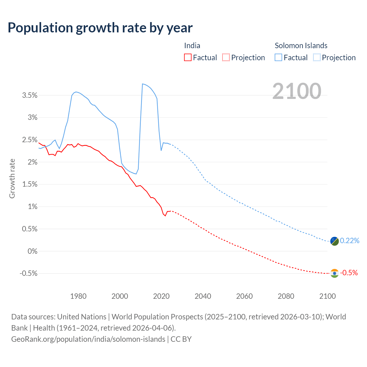 - For the last 10 years, India has had an average growth rate of +1.03% per year vs +2.95% in the Solomon Islands.