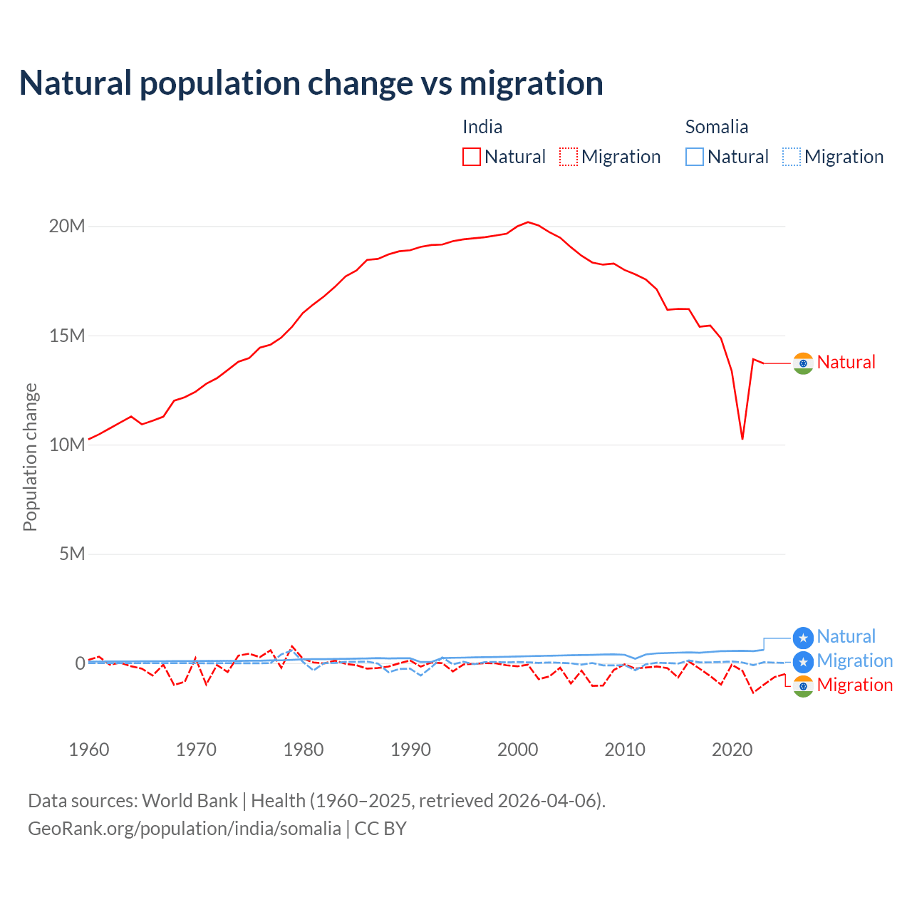 Over the last 10 years, 96.4% of the population change in India is from natural causes (a gain of 145,503,378 people) and 3.56% is from migration (a loss of 5,376,884 people). In Somalia 94.4% is from natural causes (a gain of 5,270,105 people) and 5.58% is from migration (a gain of 311,487 people).
