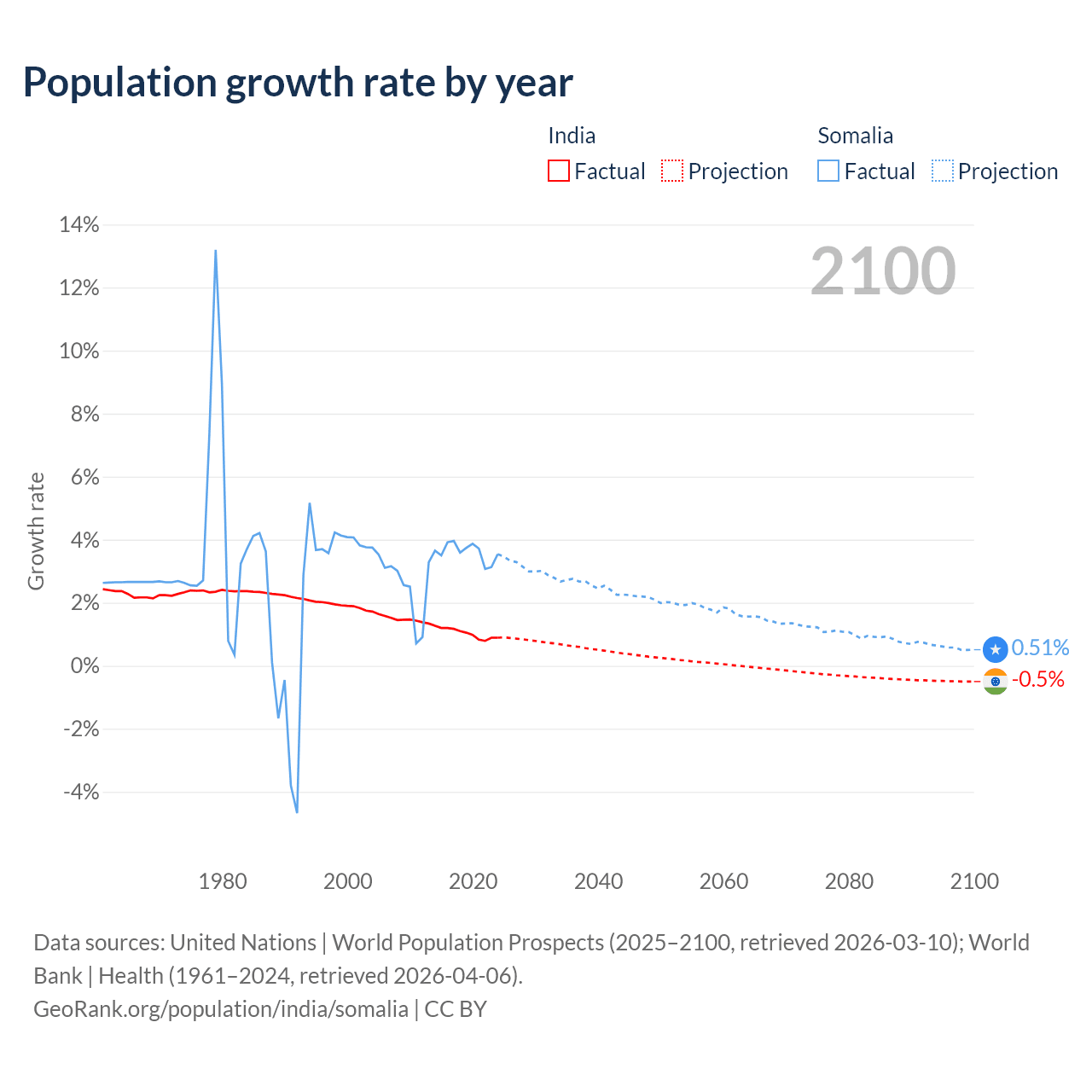 - For the last 10 years, India has had an average growth rate of +1.03% per year vs +3.61% in Somalia.