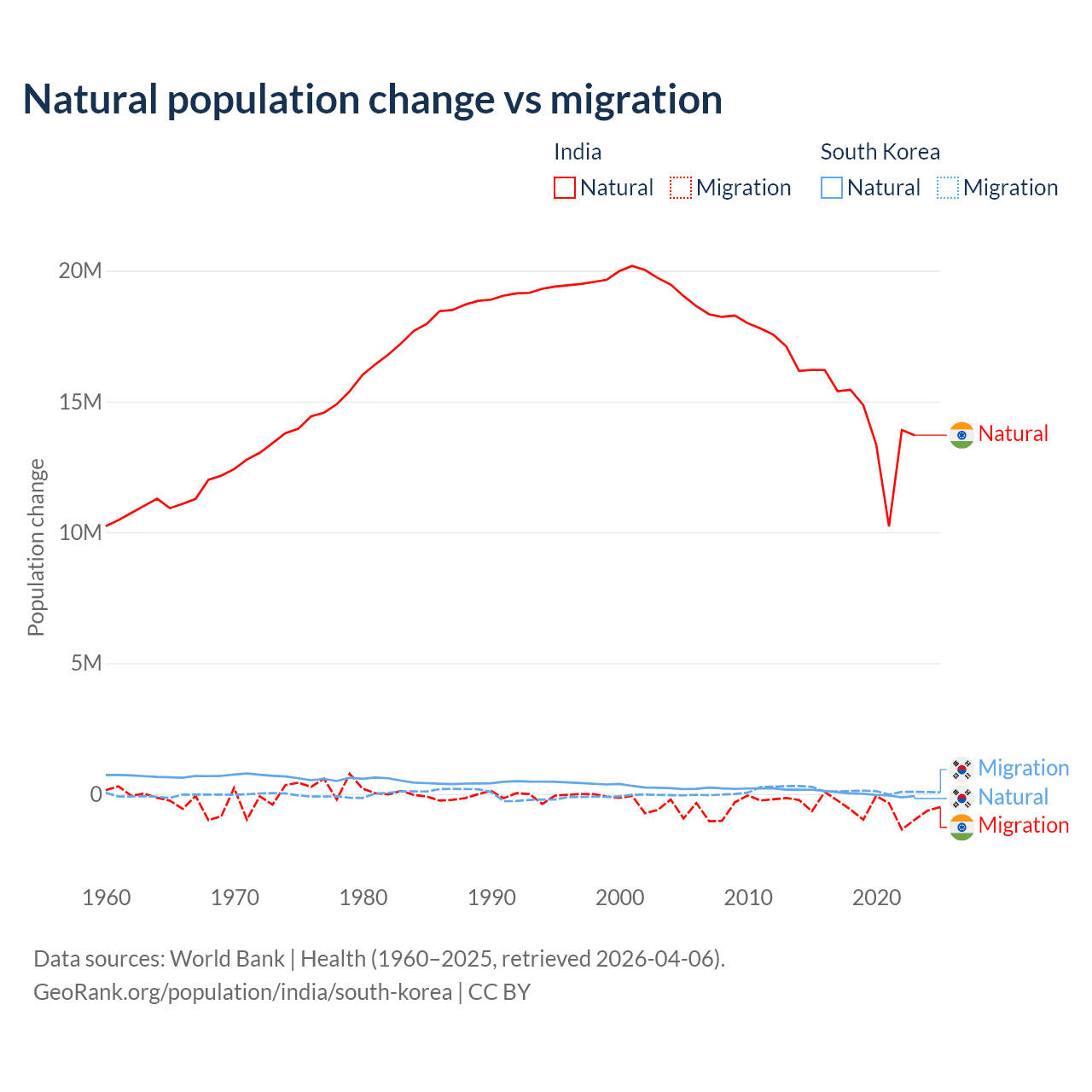Over the last 10 years, 96.4% of the population change in India is from natural causes (a gain of 145,503,378 people) and 3.56% is from migration (a loss of 5,376,884 people). In South Korea 17.6% is from natural causes (a gain of 277,215 people) and 82.4% is from migration (a gain of 1,298,356 people).