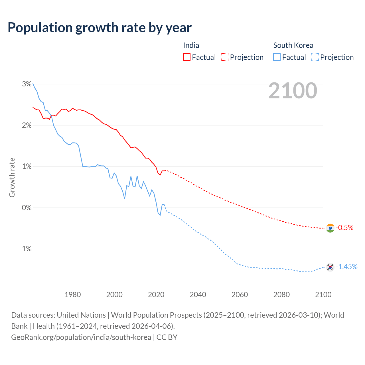 - For the last 10 years, India has had an average growth rate of +1.03% per year vs +0.24% in South Korea.