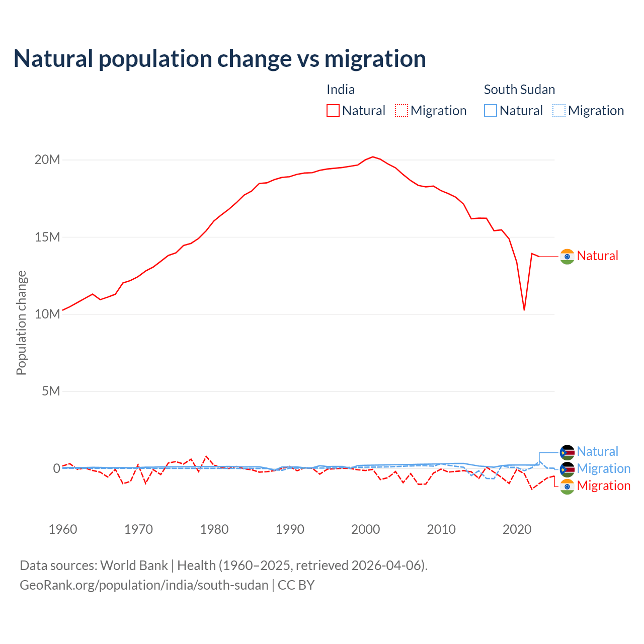 Over the last 10 years, 96.4% of the population change in India is from natural causes (a gain of 145,503,378 people) and 3.56% is from migration (a loss of 5,376,884 people). In South Sudan 57.4% is from natural causes (a gain of 1,792,135 people) and 42.6% is from migration (a loss of 1,329,606 people).
