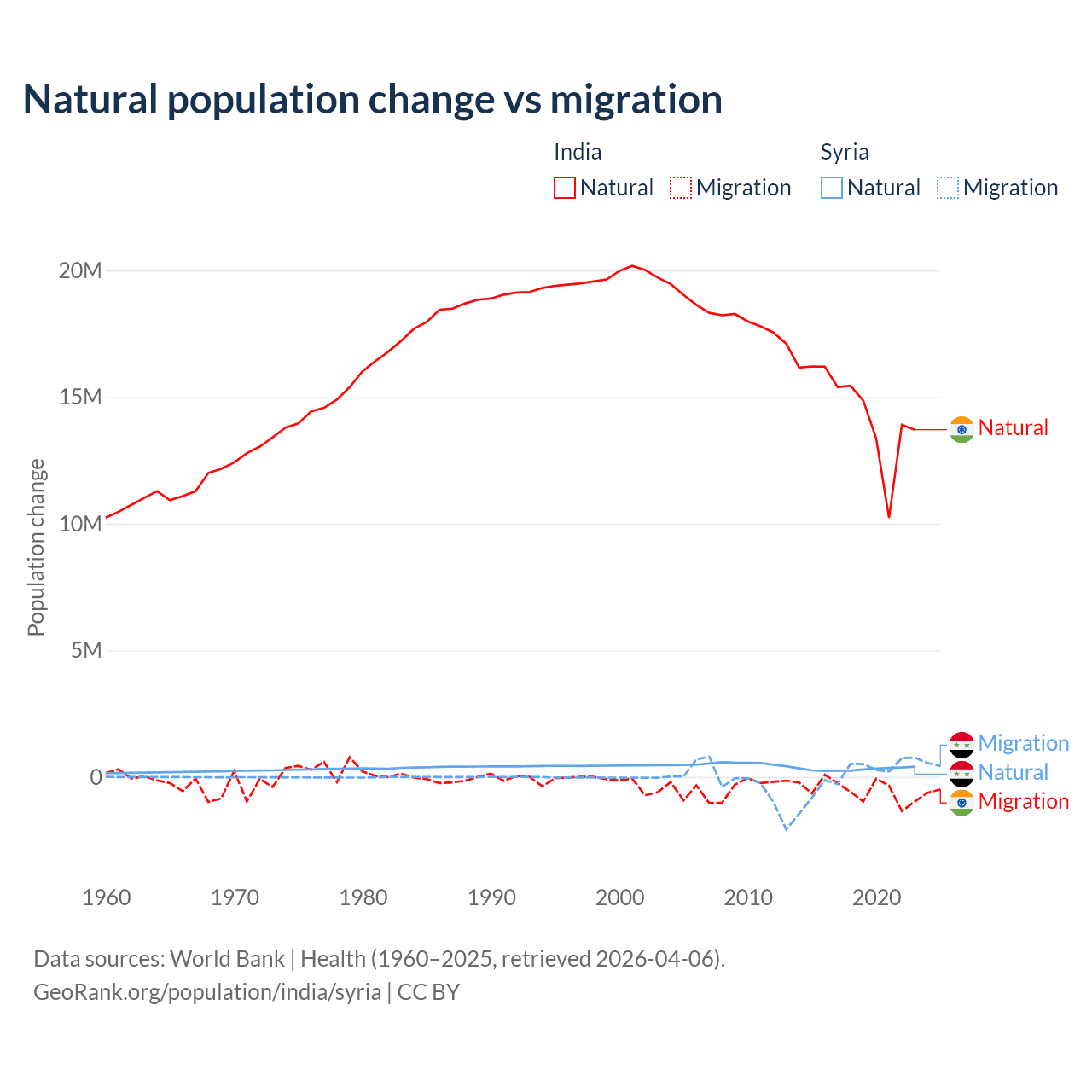 Over the last 10 years, 96.4% of the population change in India is from natural causes (a gain of 145,503,378 people) and 3.56% is from migration (a loss of 5,376,884 people). In Syria 91.3% is from natural causes (a gain of 3,047,621 people) and 8.72% is from migration (a gain of 291,069 people).