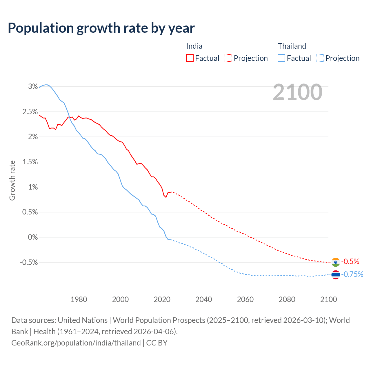 - For the last 10 years, India has had an average growth rate of +1.03% per year vs +0.23% in Thailand.