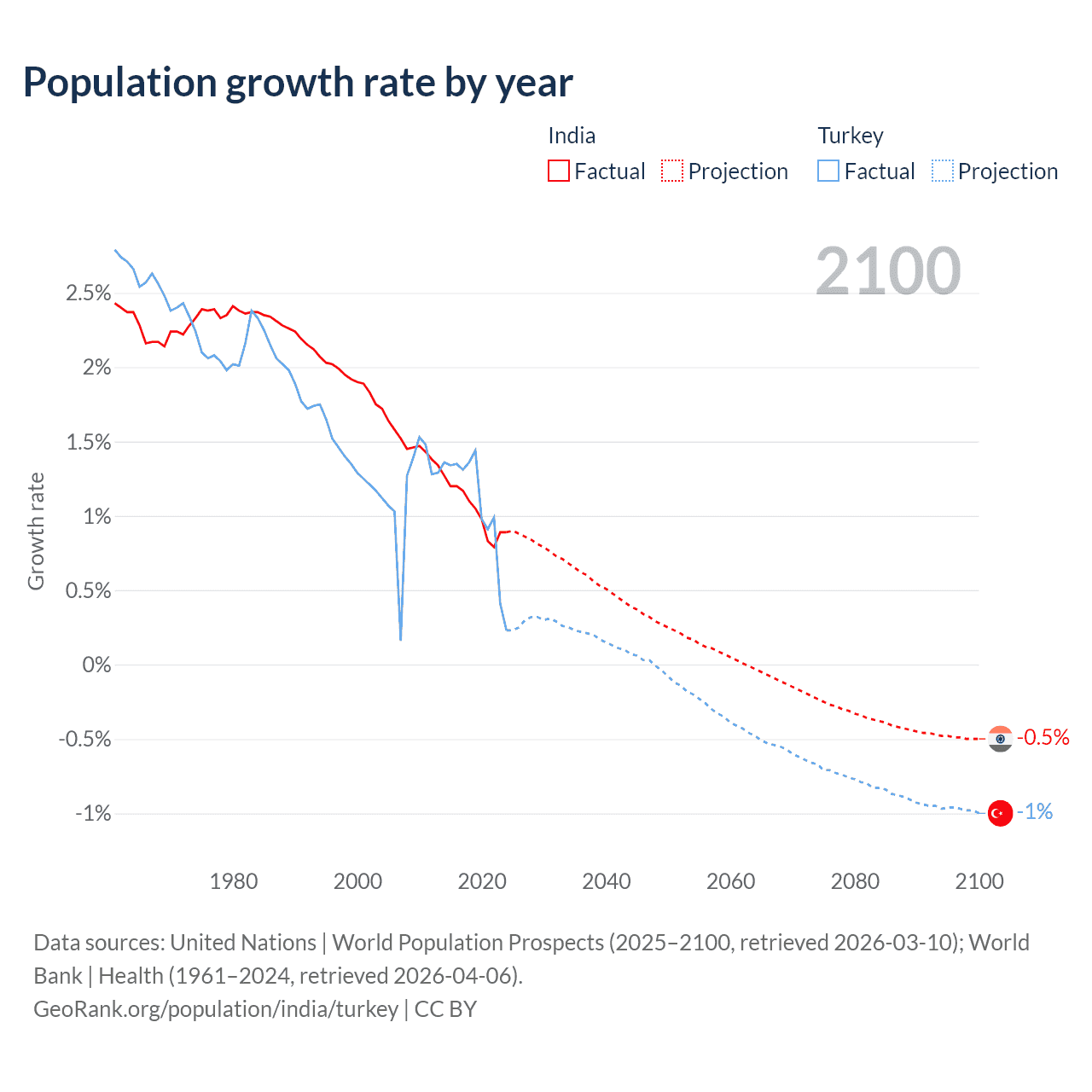- For the last 10 years, India has had an average growth rate of +1.03% per year vs +1.06% in Turkey.