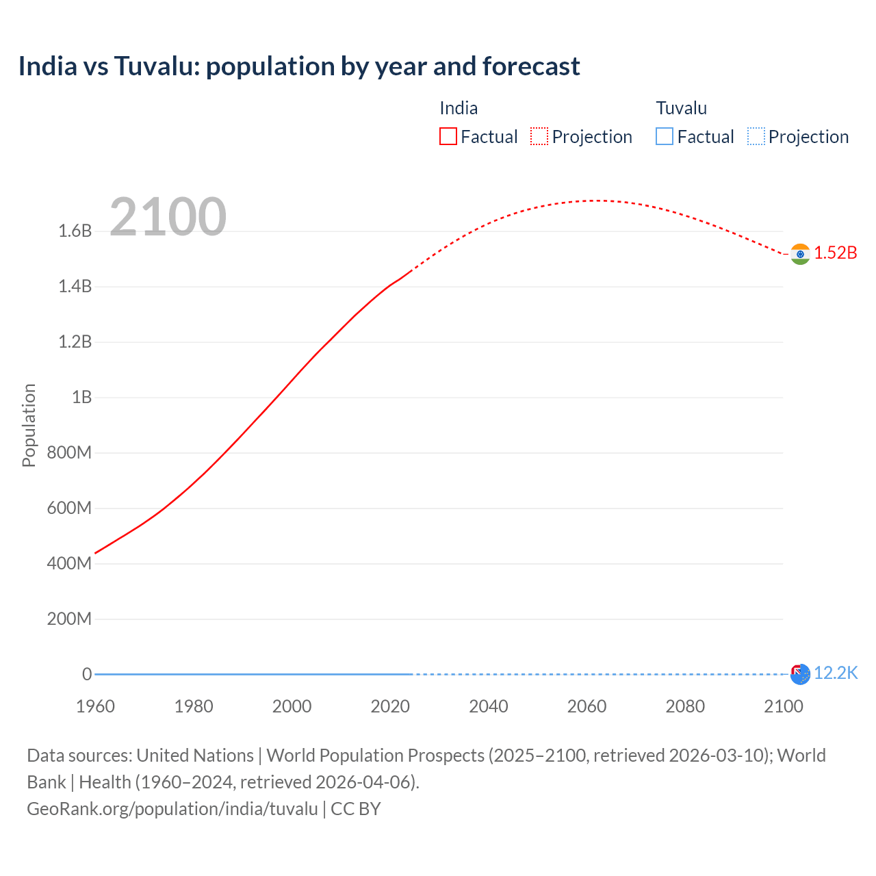 India vs Tuvalu: population by year and forecast