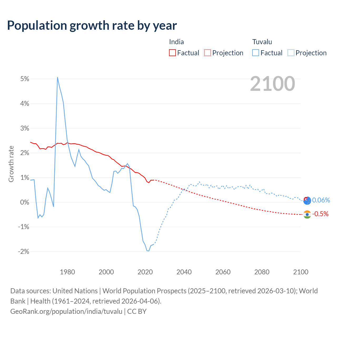 - For the last 10 years, India has had an average growth rate of +1.03% per year vs -1.19% in Tuvalu.