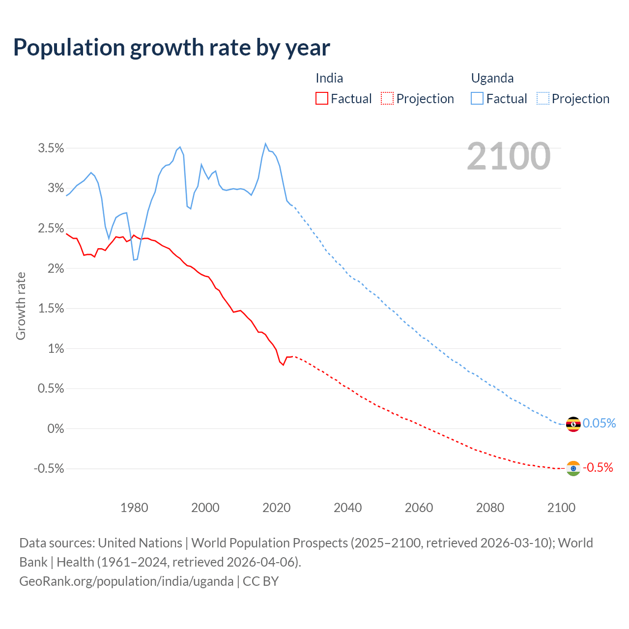 - For the last 10 years, India has had an average growth rate of +1.03% per year vs +3.21% in Uganda.