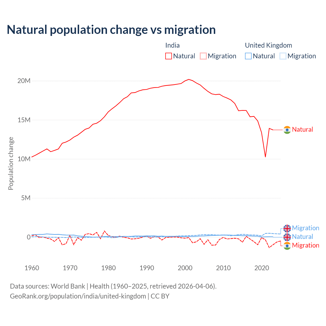 Over the last 10 years, 96.4% of the population change in India is from natural causes (a gain of 145,503,378 people) and 3.56% is from migration (a loss of 5,376,884 people). In the United Kingdom 23.9% is from natural causes (a gain of 1,033,129 people) and 76.1% is from migration (a gain of 3,283,101 people).