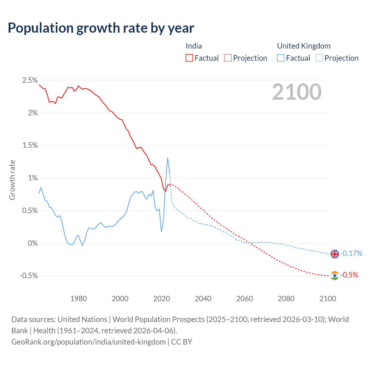 - For the last 10 years, India has had an average growth rate of +1.03% per year vs +0.7% in the United Kingdom.