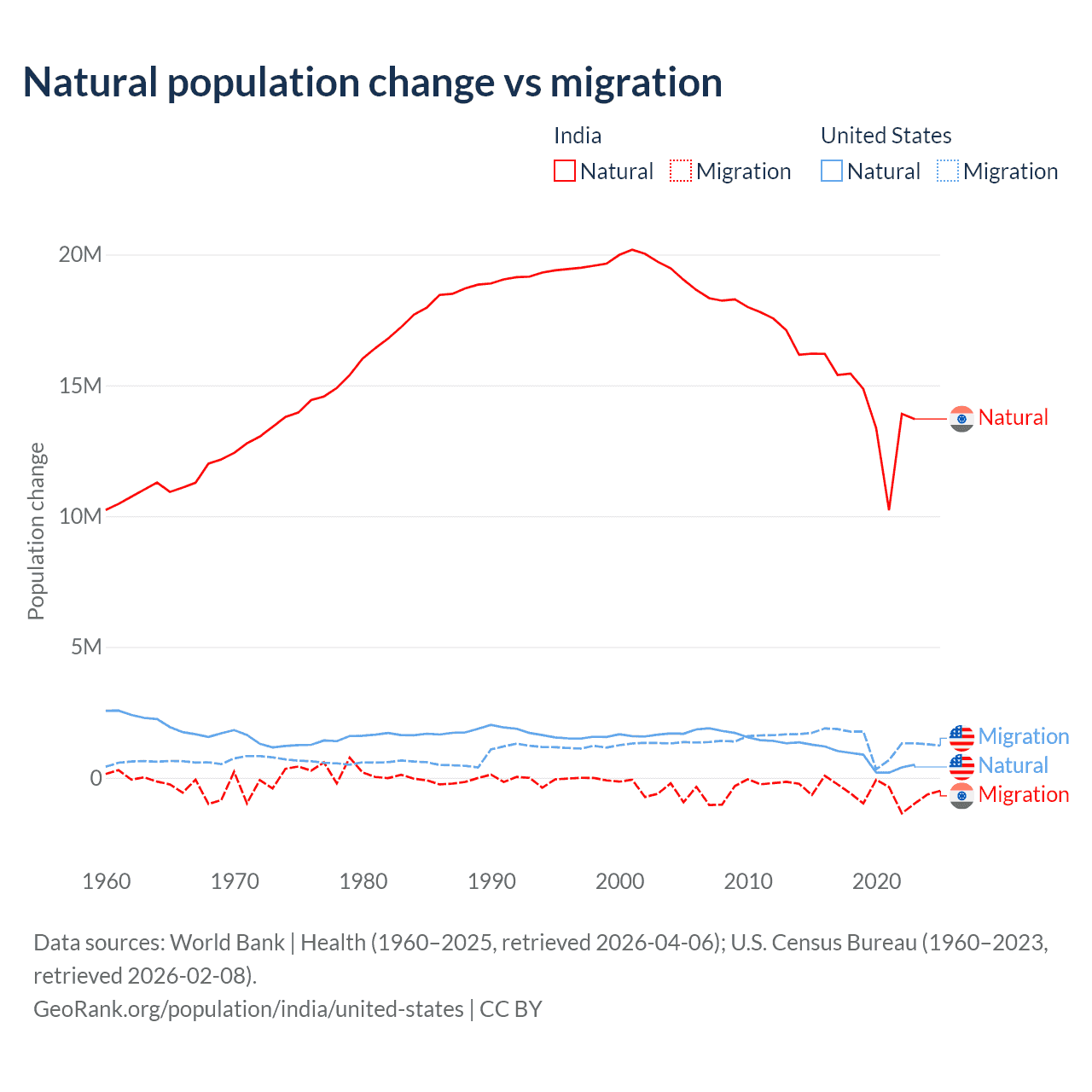 Over the last 10 years, 96.4% of the population change in India is from natural causes (a gain of 145,503,378 people) and 3.56% is from migration (a loss of 5,376,884 people). In the United States 35.8% is from natural causes (a gain of 8,005,866 people) and 64.2% is from migration (a gain of 14,334,286 people).