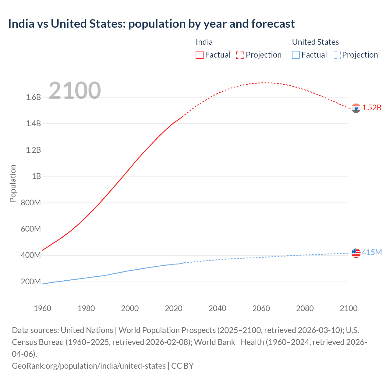 Data sources: World Bank | Health (1960–2024, retrieved 2026-04-06); United Nations | World Population Prospects (1960–2026, retrieved 2026-03-10); U.S. Census Bureau (1960–2025, retrieved 2026-02-08); Central Intelligence Agency (CIA) (2000–2019, retrieved 2026-02-20).