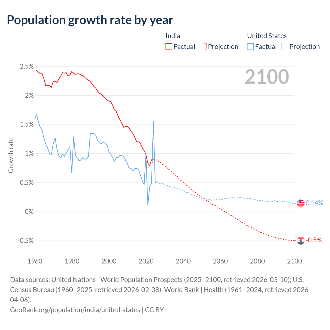 - For the last 10 years, India has had an average growth rate of +1.03% per year vs +0.65% in the United States.