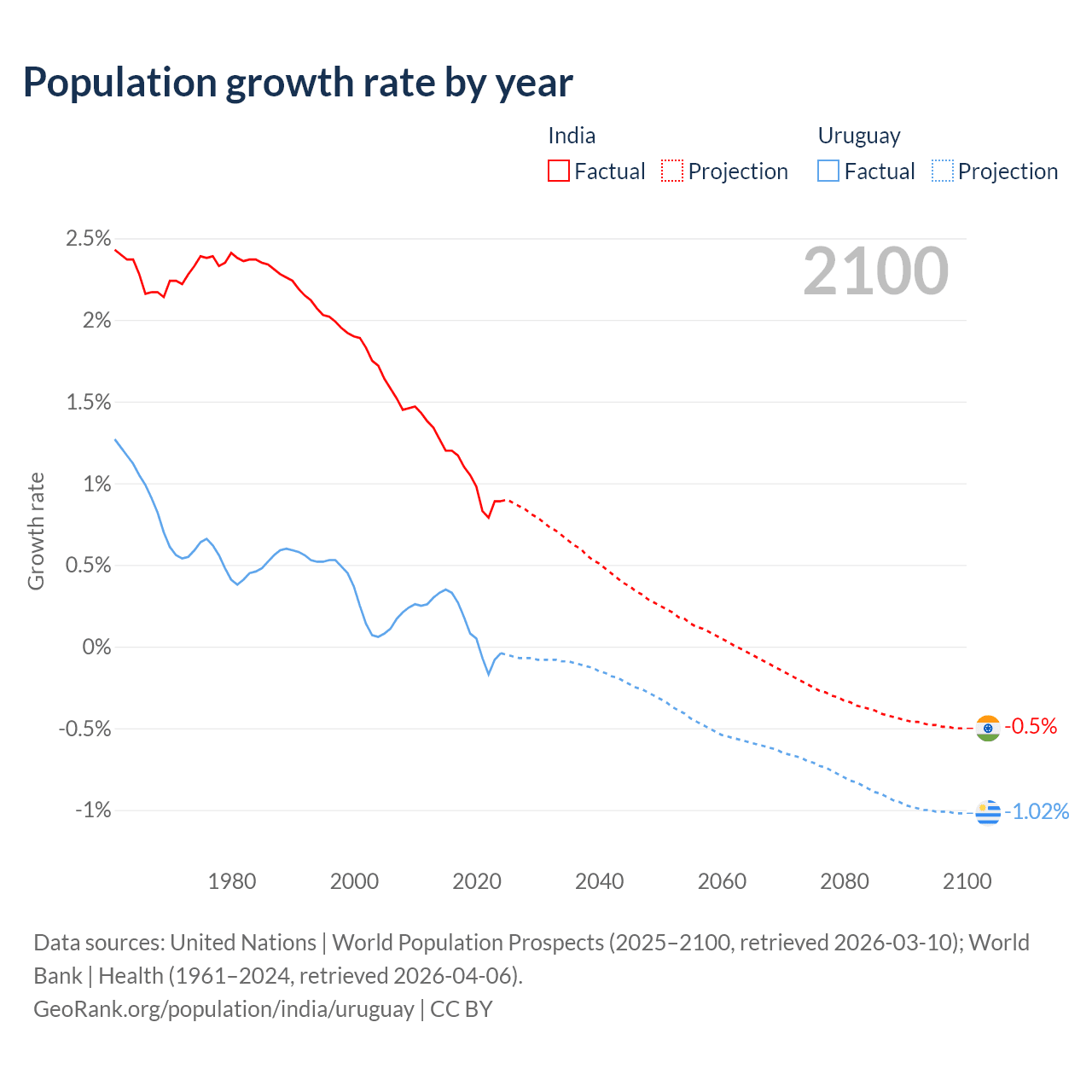- For the last 10 years, India has had an average growth rate of +1.03% per year vs +0.11% in Uruguay.