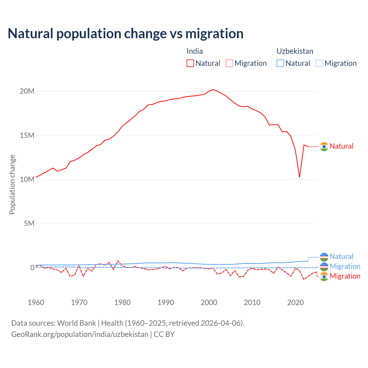 Over the last 10 years, 96.4% of the population change in India is from natural causes (a gain of 145,503,378 people) and 3.56% is from migration (a loss of 5,376,884 people). In Uzbekistan 98.2% is from natural causes (a gain of 6,161,117 people) and 1.84% is from migration (a loss of 115,398 people).