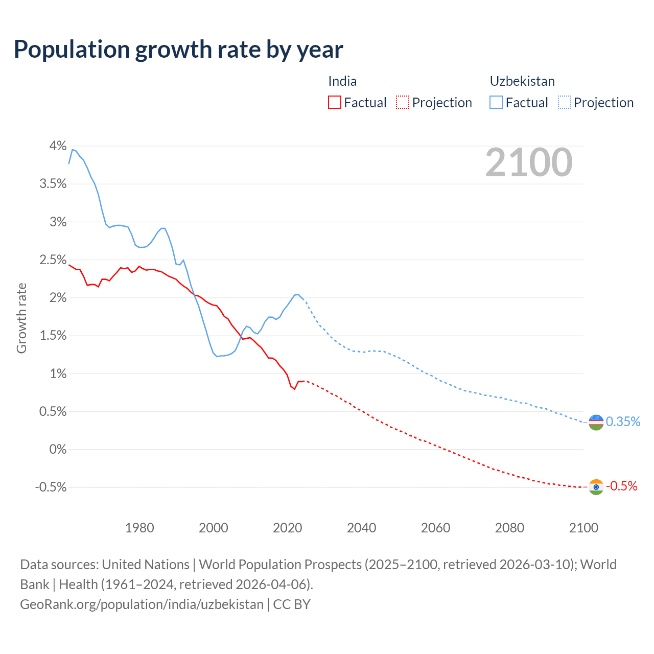 - For the last 10 years, India has had an average growth rate of +1.03% per year vs +1.85% in Uzbekistan.