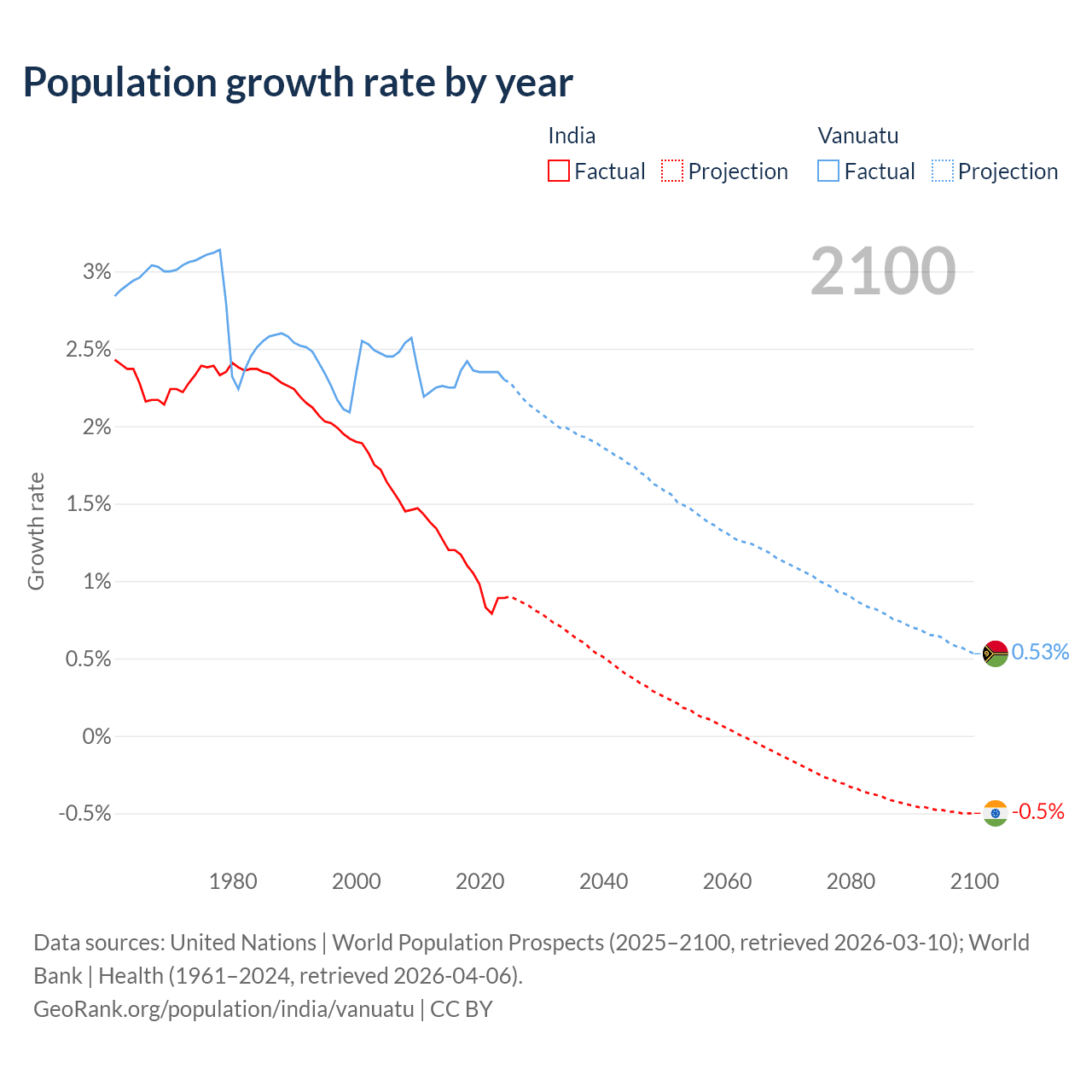 - For the last 10 years, India has had an average growth rate of +1.03% per year vs +2.33% in Vanuatu.