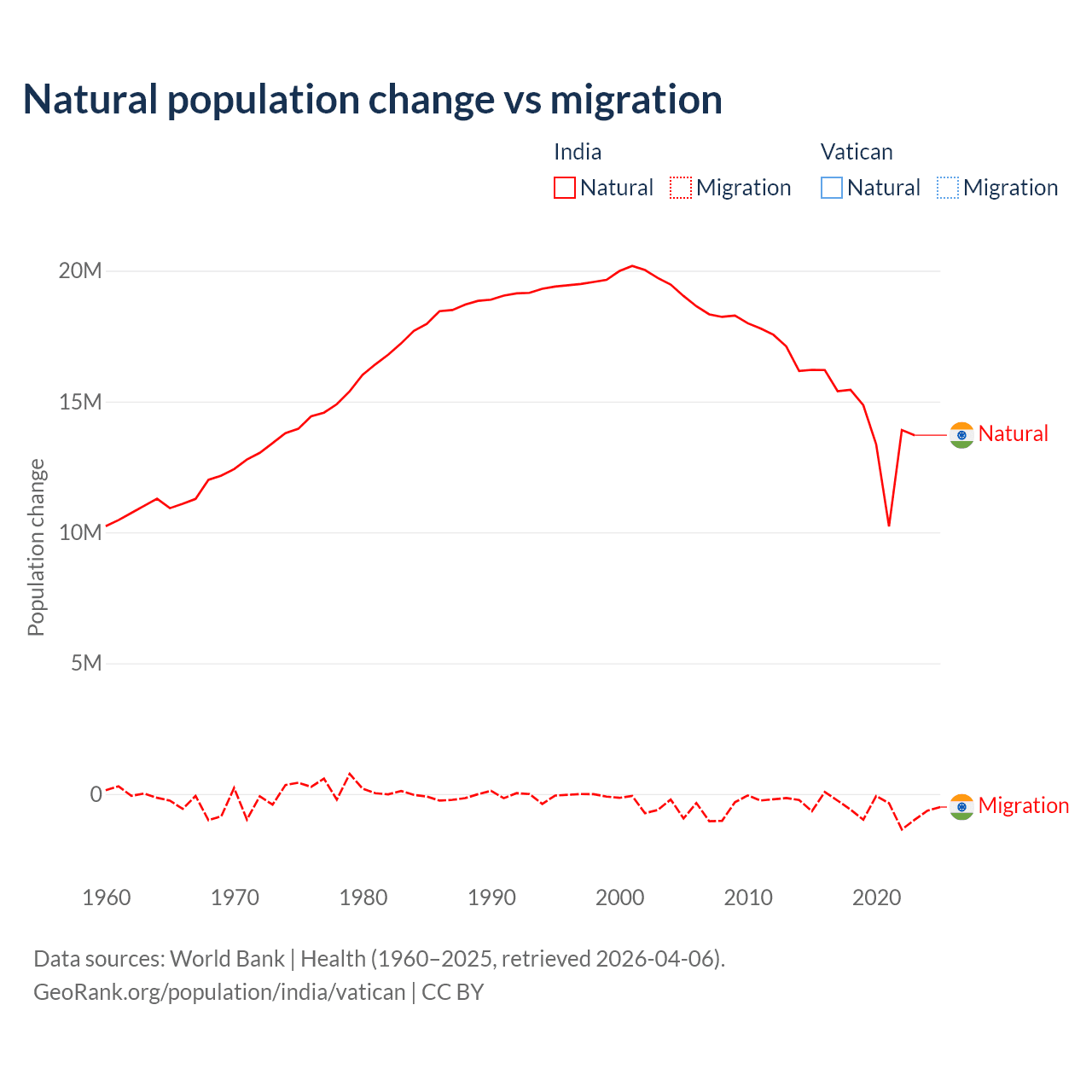 - For the last 10 years, India has had an average growth rate of +1.03% per year vs +1.9% in the Vatican.