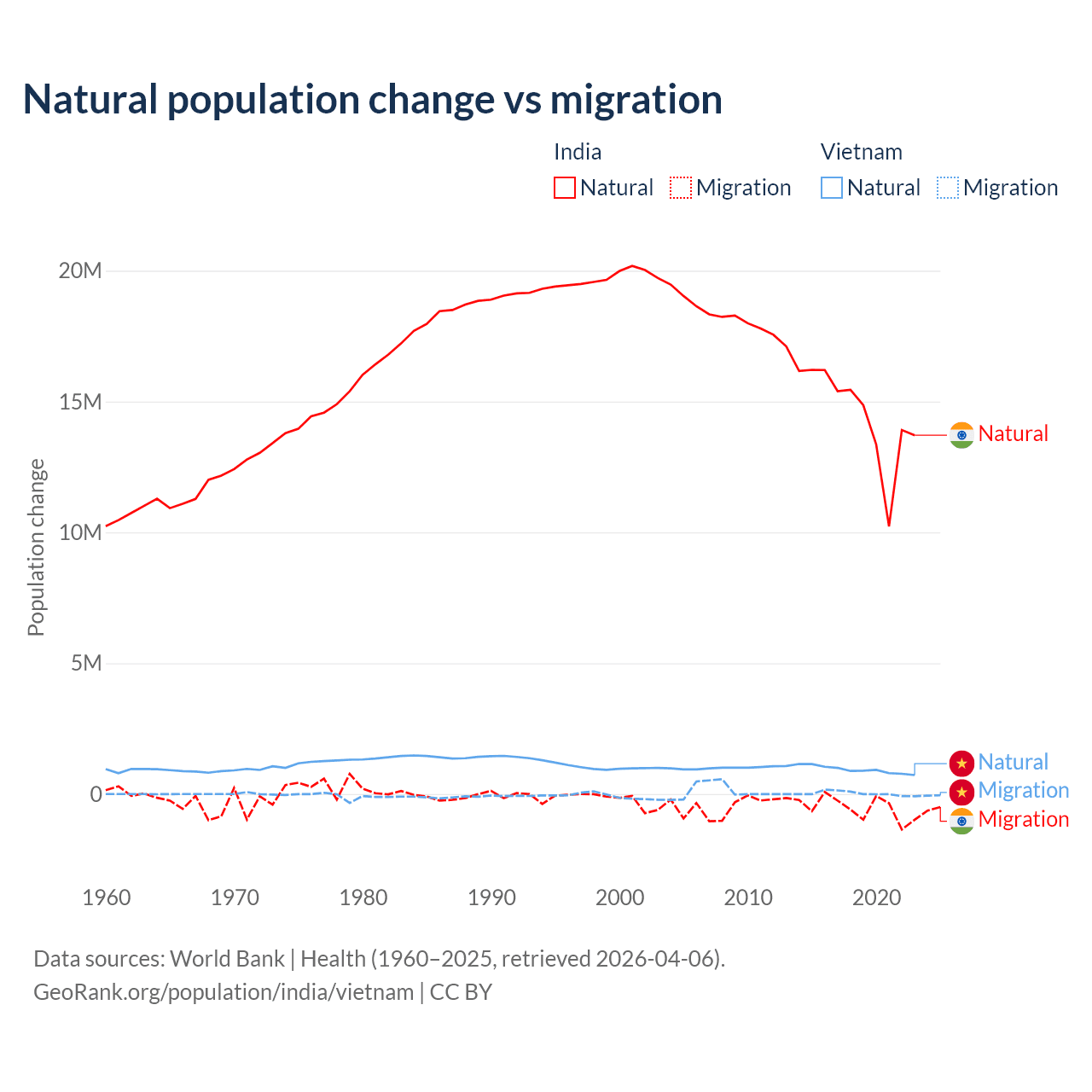 Over the last 10 years, 96.4% of the population change in India is from natural causes (a gain of 145,503,378 people) and 3.56% is from migration (a loss of 5,376,884 people). In Vietnam 97.7% is from natural causes (a gain of 9,349,756 people) and 2.29% is from migration (a gain of 219,073 people).