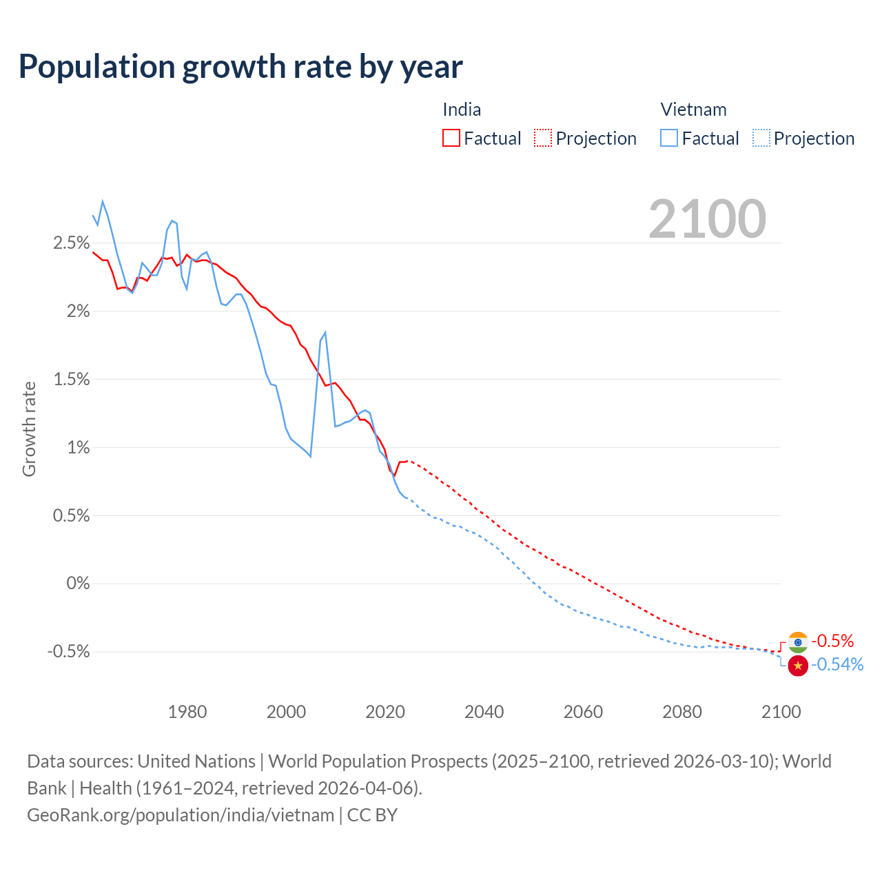 - For the last 10 years, India has had an average growth rate of +1.03% per year vs +0.99% in Vietnam.