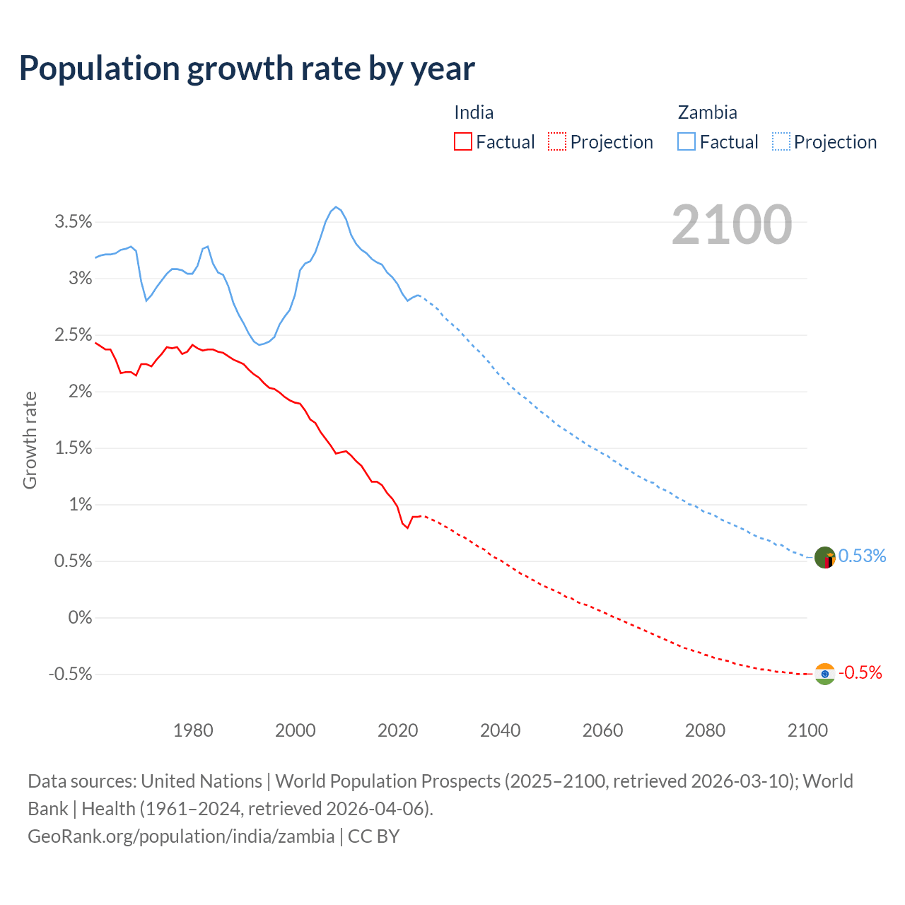 - For the last 10 years, India has had an average growth rate of +1.03% per year vs +3% in Zambia.