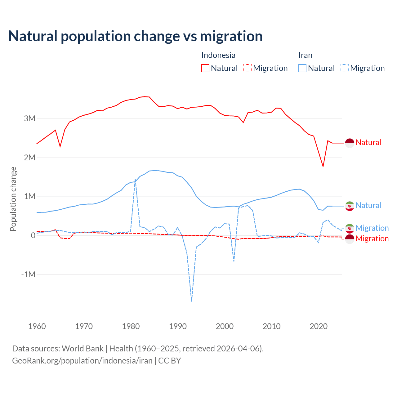 Over the last 10 years, 98.9% of the population change in Indonesia is from natural causes (a gain of 25,242,860 people) and 1.1% is from migration (a loss of 280,258 people). In Iran 92.5% is from natural causes (a gain of 9,405,860 people) and 7.46% is from migration (a gain of 757,979 people).