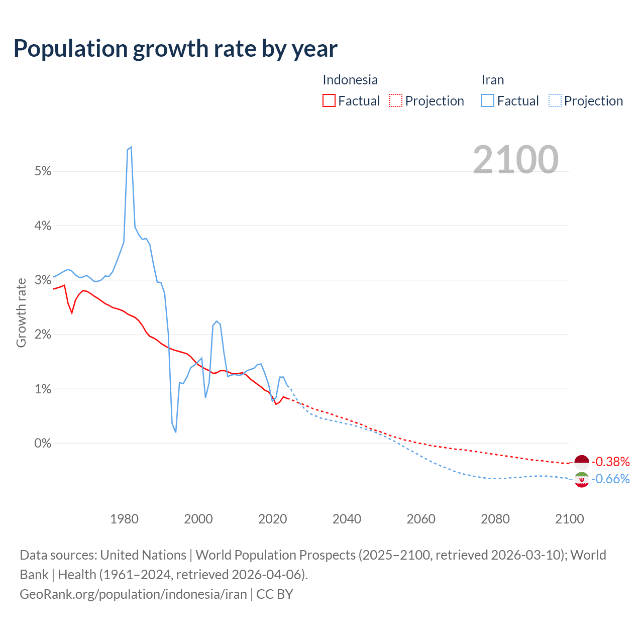 - For the last 10 years, Indonesia has had an average growth rate of +0.94% per year vs +1.19% in Iran.