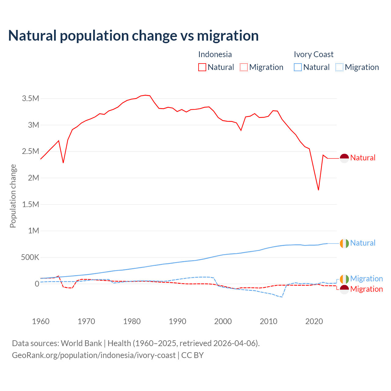 Over the last 10 years, 98.9% of the population change in Indonesia is from natural causes (a gain of 25,242,860 people) and 1.1% is from migration (a loss of 280,258 people). In Ivory Coast 99.7% is from natural causes (a gain of 7,348,944 people) and 0.33% is from migration (a gain of 24,432 people).