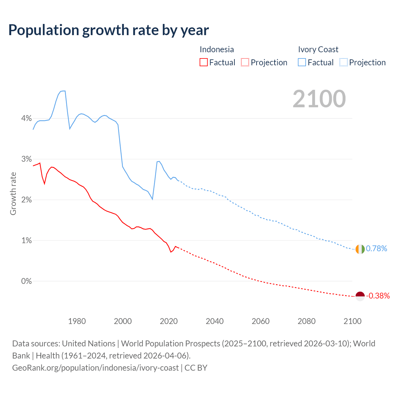 - For the last 10 years, Indonesia has had an average growth rate of +0.94% per year vs +2.65% in Ivory Coast.
