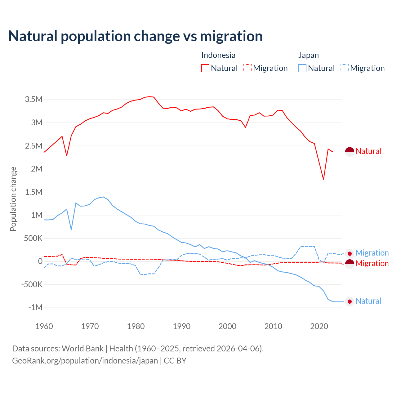 Over the last 10 years, 98.9% of the population change in Indonesia is from natural causes (a gain of 25,242,860 people) and 1.1% is from migration (a loss of 280,258 people). In Japan 73.6% is from natural causes (a loss of 5,178,838 people) and 26.4% is from migration (a gain of 1,860,103 people).