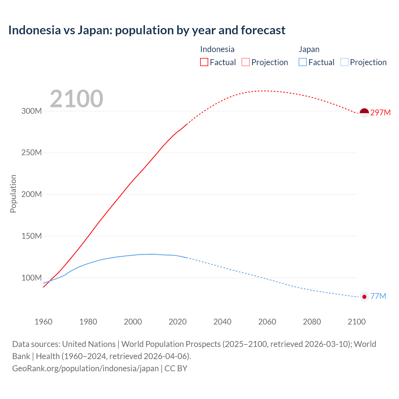 Indonesia vs Japan: population by year and forecast