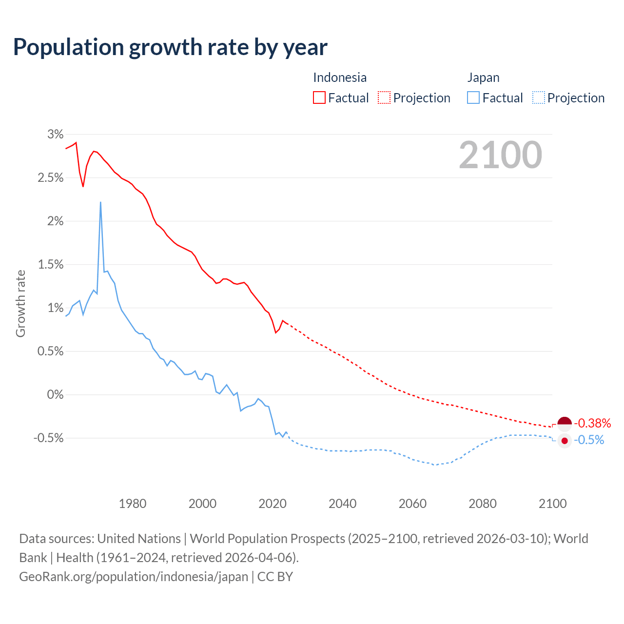 - For the last 10 years, Indonesia has had an average growth rate of +0.94% per year vs -0.25% in Japan.