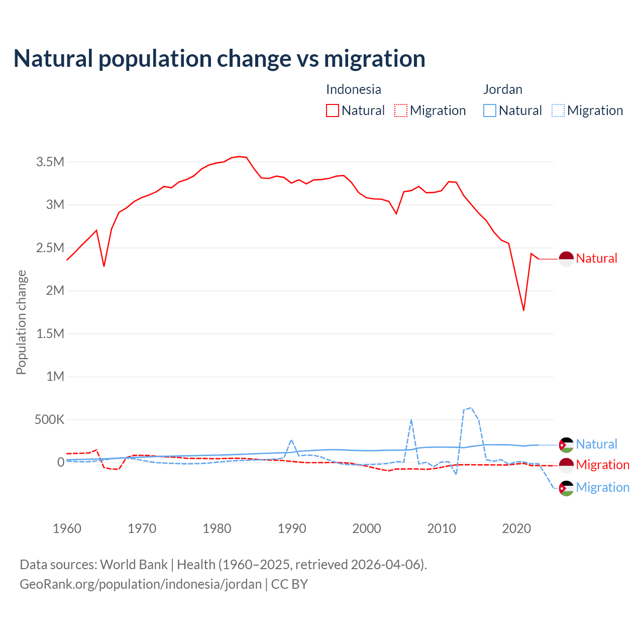 Over the last 10 years, 98.9% of the population change in Indonesia is from natural causes (a gain of 25,242,860 people) and 1.1% is from migration (a loss of 280,258 people). In Jordan 63.2% is from natural causes (a gain of 1,991,452 people) and 36.8% is from migration (a gain of 1,157,625 people).