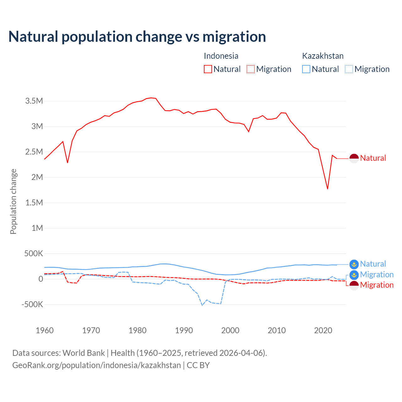 Over the last 10 years, 98.9% of the population change in Indonesia is from natural causes (a gain of 25,242,860 people) and 1.1% is from migration (a loss of 280,258 people). In Kazakhstan 98.7% is from natural causes (a gain of 2,743,094 people) and 1.33% is from migration (a gain of 36,908 people).