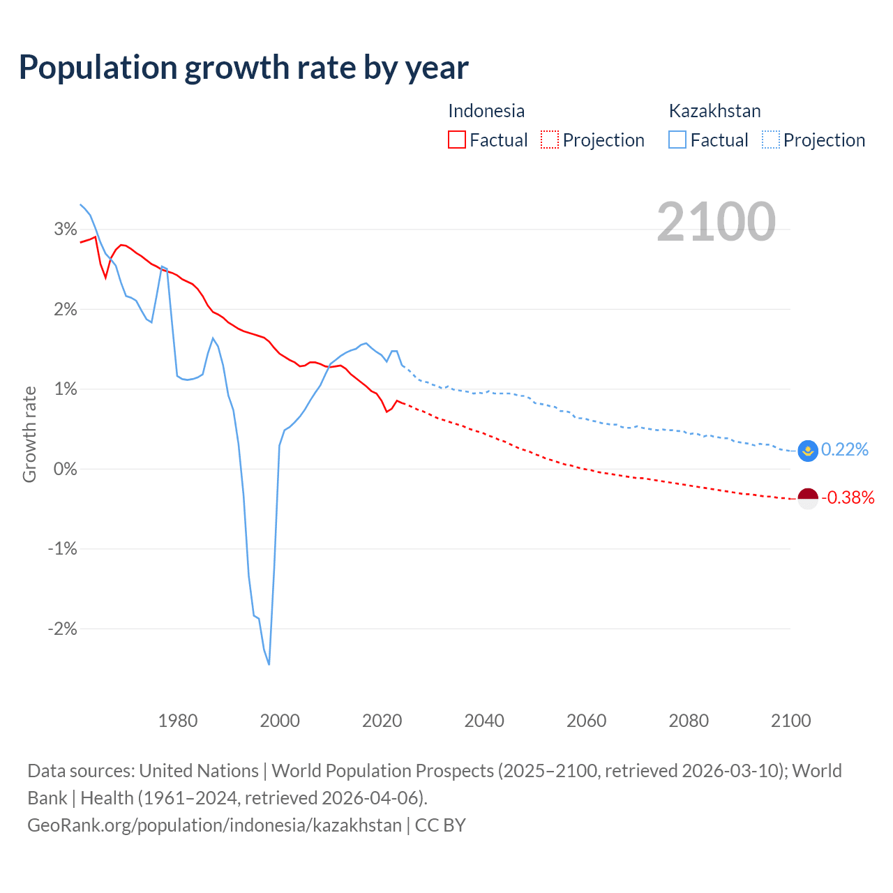 - For the last 10 years, Indonesia has had an average growth rate of +0.94% per year vs +1.46% in Kazakhstan.