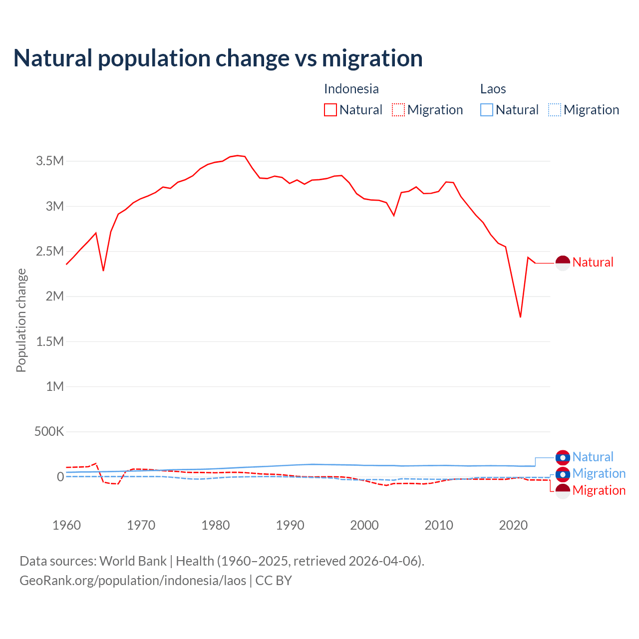 Over the last 10 years, 98.9% of the population change in Indonesia is from natural causes (a gain of 25,242,860 people) and 1.1% is from migration (a loss of 280,258 people). In Laos 90.6% is from natural causes (a gain of 1,183,013 people) and 9.41% is from migration (a loss of 122,899 people).