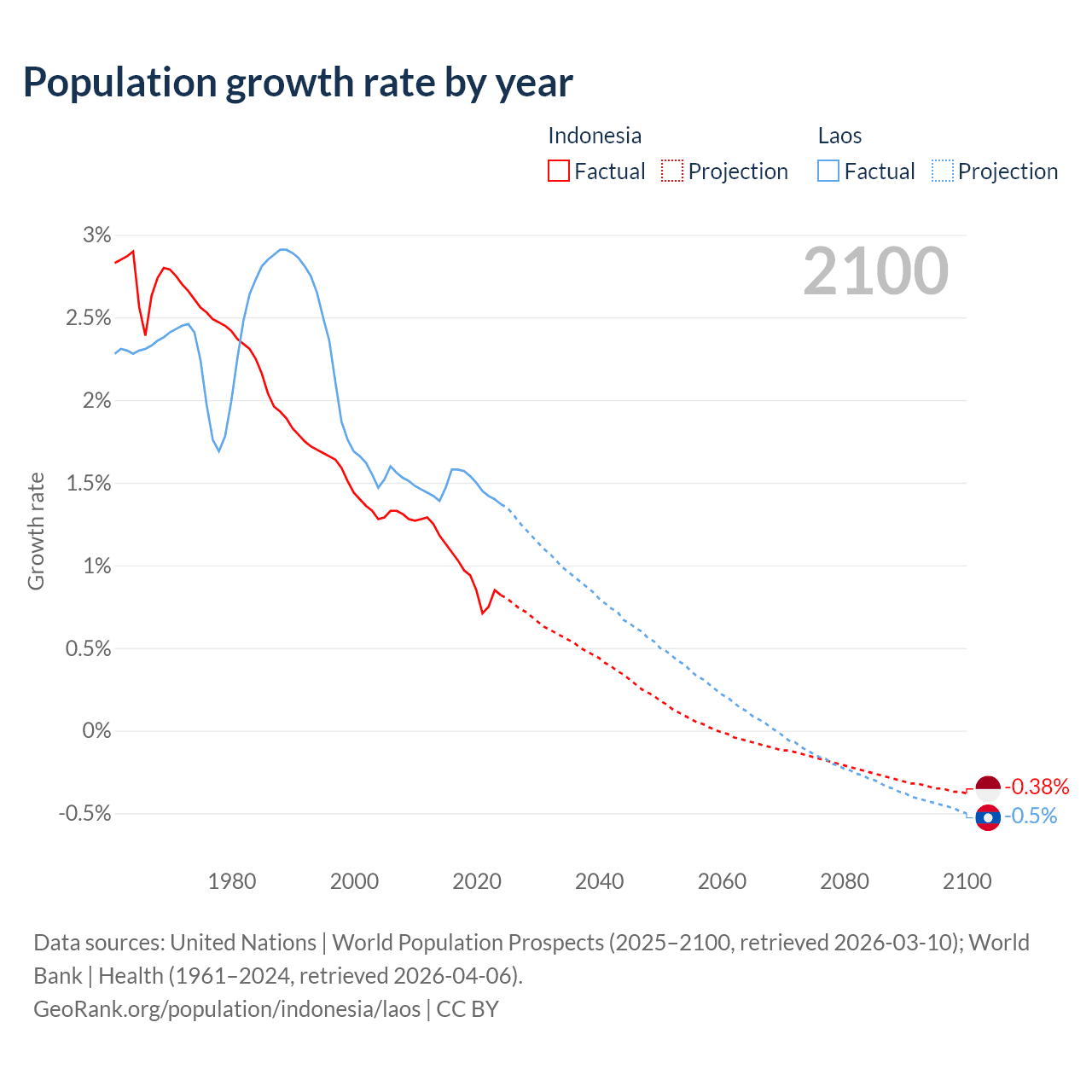 - For the last 10 years, Indonesia has had an average growth rate of +0.94% per year vs +1.48% in Laos.