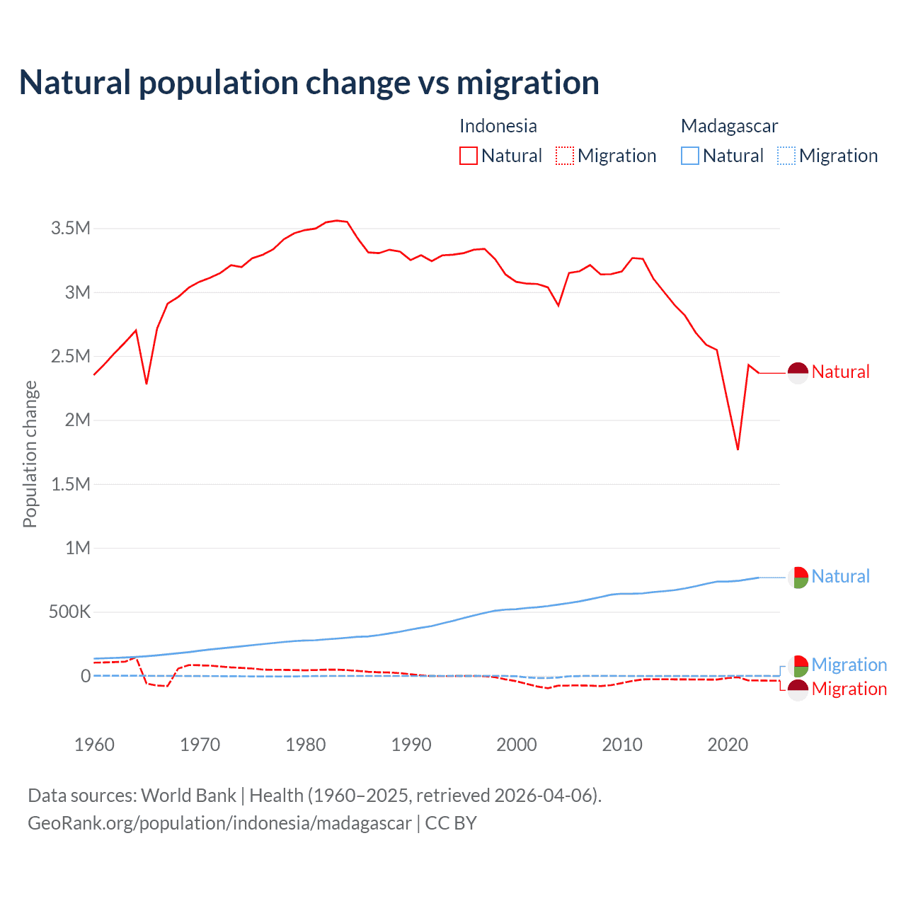 Over the last 10 years, 98.9% of the population change in Indonesia is from natural causes (a gain of 25,242,860 people) and 1.1% is from migration (a loss of 280,258 people). In Madagascar 99.7% is from natural causes (a gain of 7,165,578 people) and 0.31% is from migration (a loss of 22,384 people).