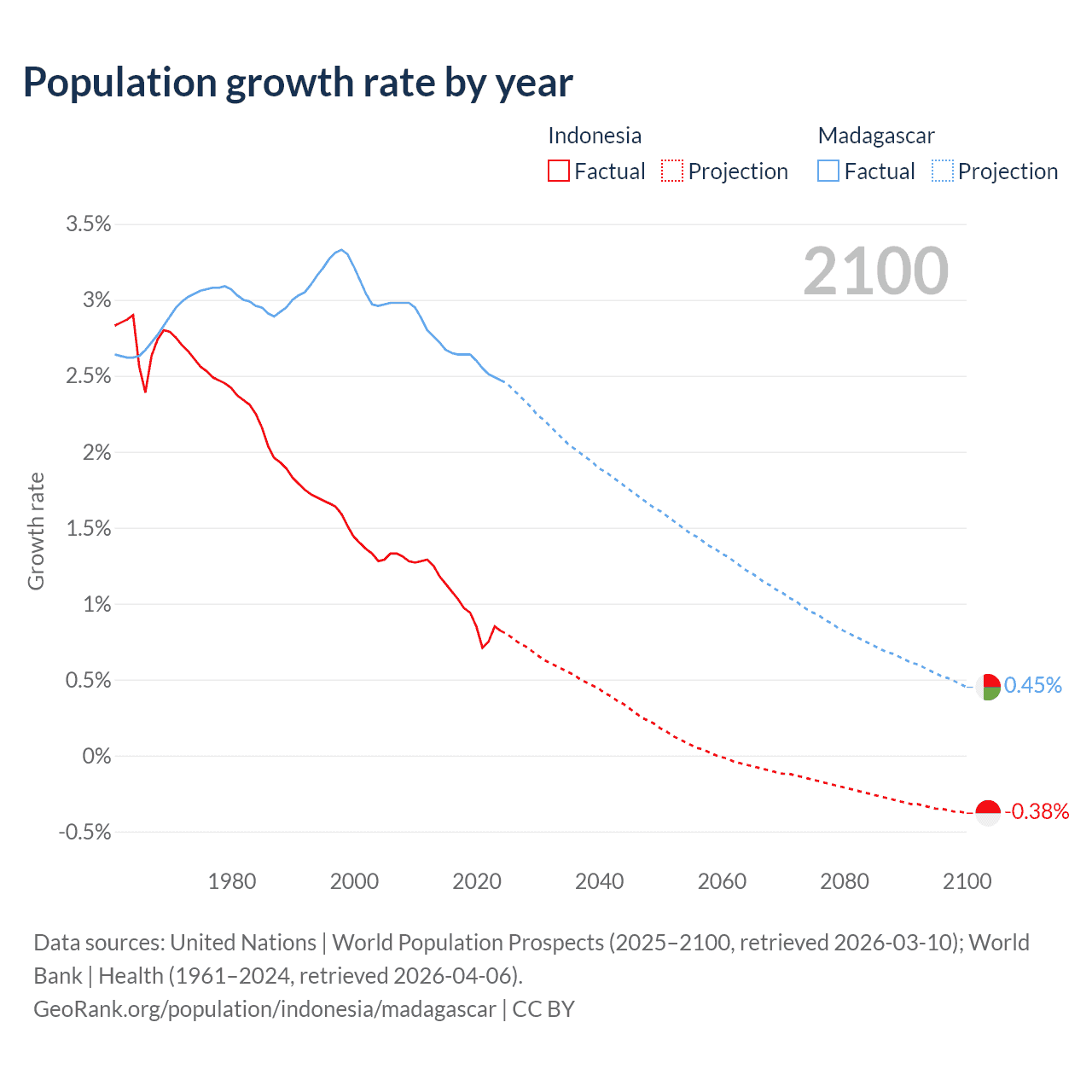 - For the last 10 years, Indonesia has had an average growth rate of +0.94% per year vs +2.6% in Madagascar.