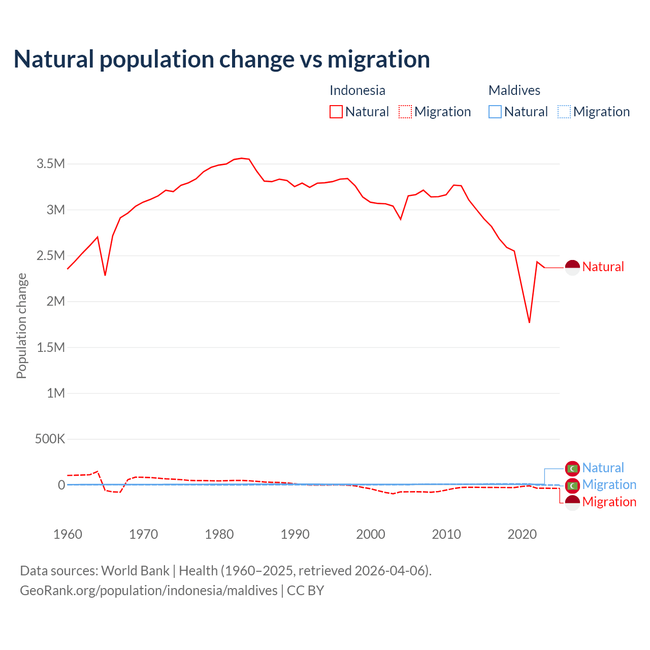 Over the last 10 years, 98.9% of the population change in Indonesia is from natural causes (a gain of 25,242,860 people) and 1.1% is from migration (a loss of 280,258 people). In Maldives 42.7% is from natural causes (a gain of 51,342 people) and 57.3% is from migration (a gain of 68,788 people).