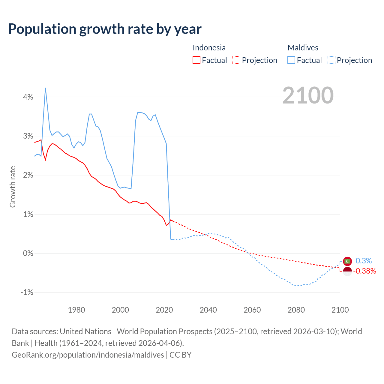 - For the last 10 years, Indonesia has had an average growth rate of +0.94% per year vs +2.56% in Maldives.