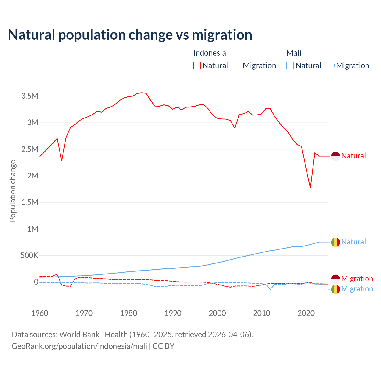 Over the last 10 years, 98.9% of the population change in Indonesia is from natural causes (a gain of 25,242,860 people) and 1.1% is from migration (a loss of 280,258 people). In Mali 94.9% is from natural causes (a gain of 6,749,473 people) and 5.13% is from migration (a loss of 365,292 people).