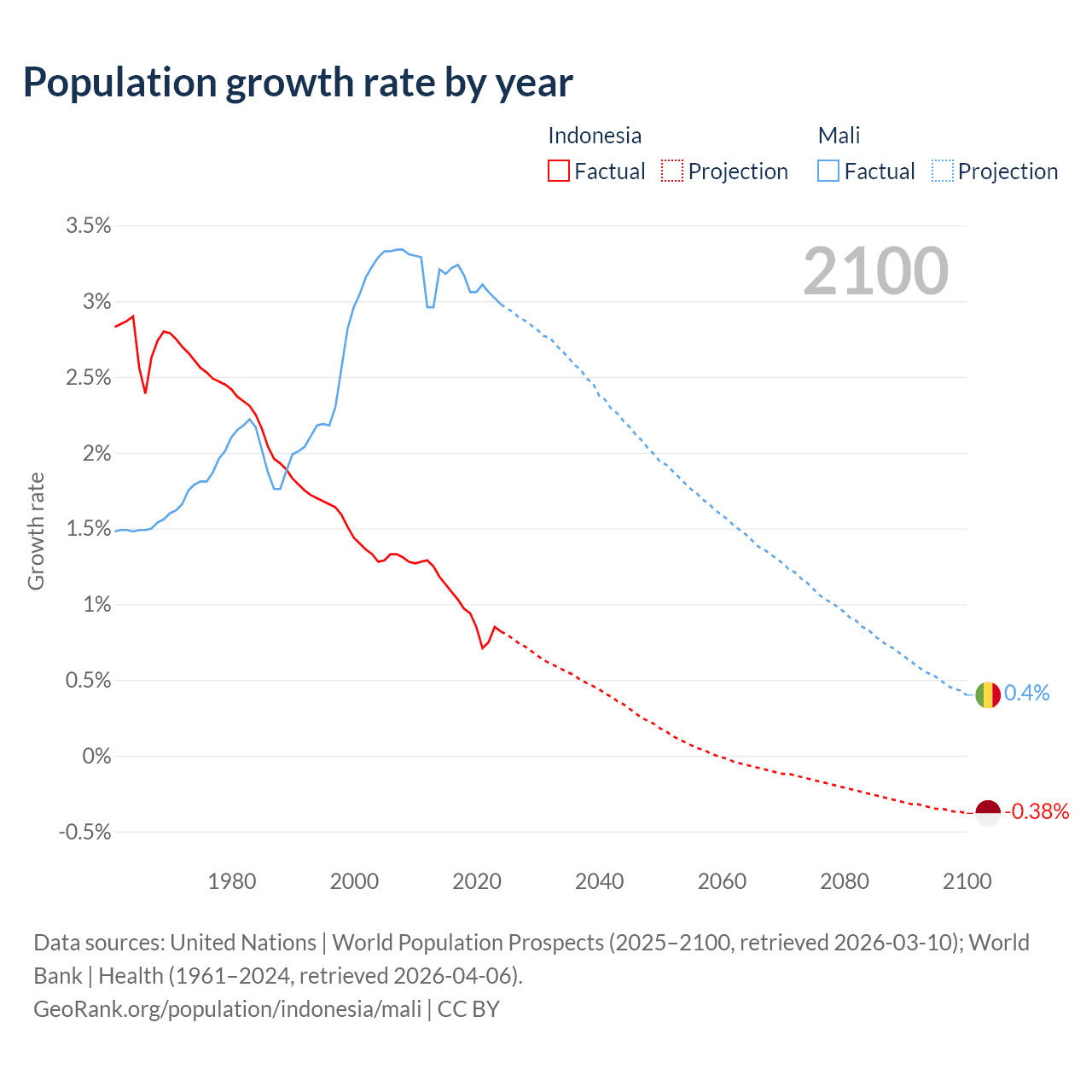 - For the last 10 years, Indonesia has had an average growth rate of +0.94% per year vs +3.12% in Mali.