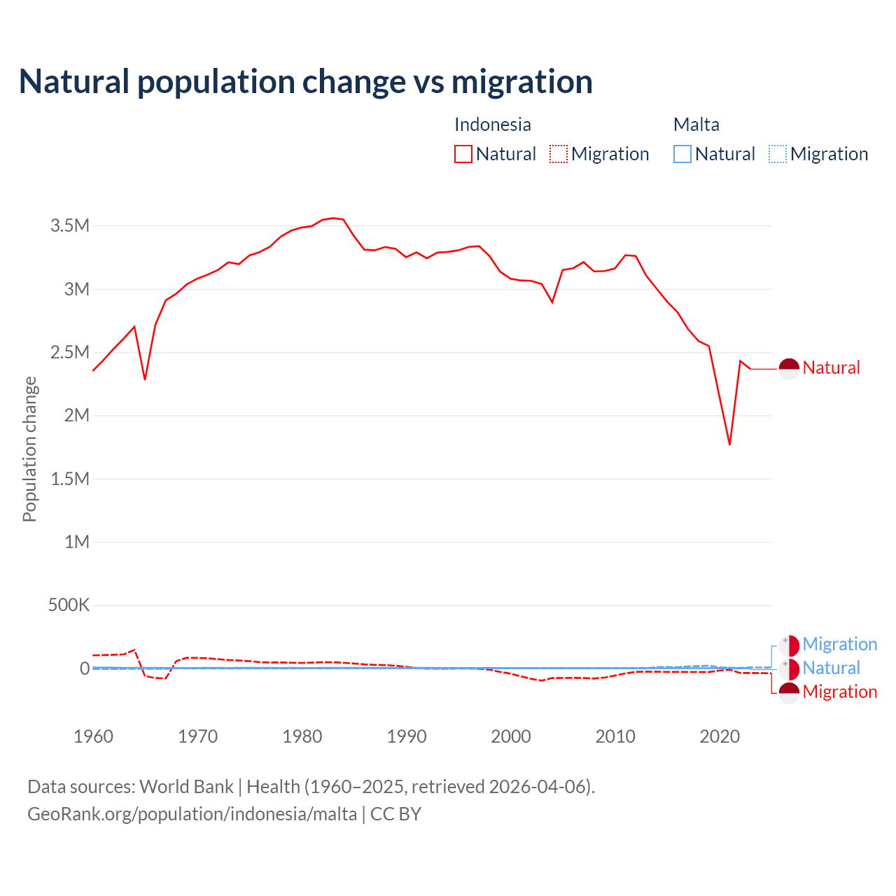 Over the last 10 years, 98.9% of the population change in Indonesia is from natural causes (a gain of 25,242,860 people) and 1.1% is from migration (a loss of 280,258 people). In Malta 5.84% is from natural causes (a gain of 6,181 people) and 94.2% is from migration (a gain of 99,652 people).