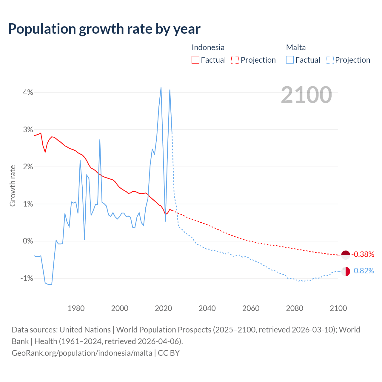 - For the last 10 years, Indonesia has had an average growth rate of +0.94% per year vs +2.69% in Malta.
