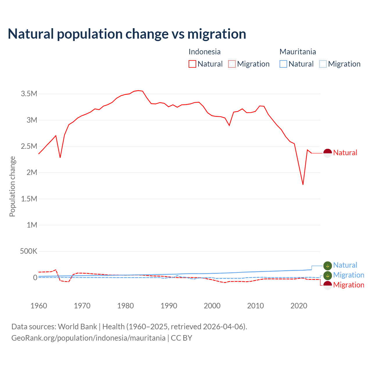 Over the last 10 years, 98.9% of the population change in Indonesia is from natural causes (a gain of 25,242,860 people) and 1.1% is from migration (a loss of 280,258 people). In Mauritania 98.9% is from natural causes (a gain of 1,320,903 people) and 1.12% is from migration (a loss of 14,982 people).