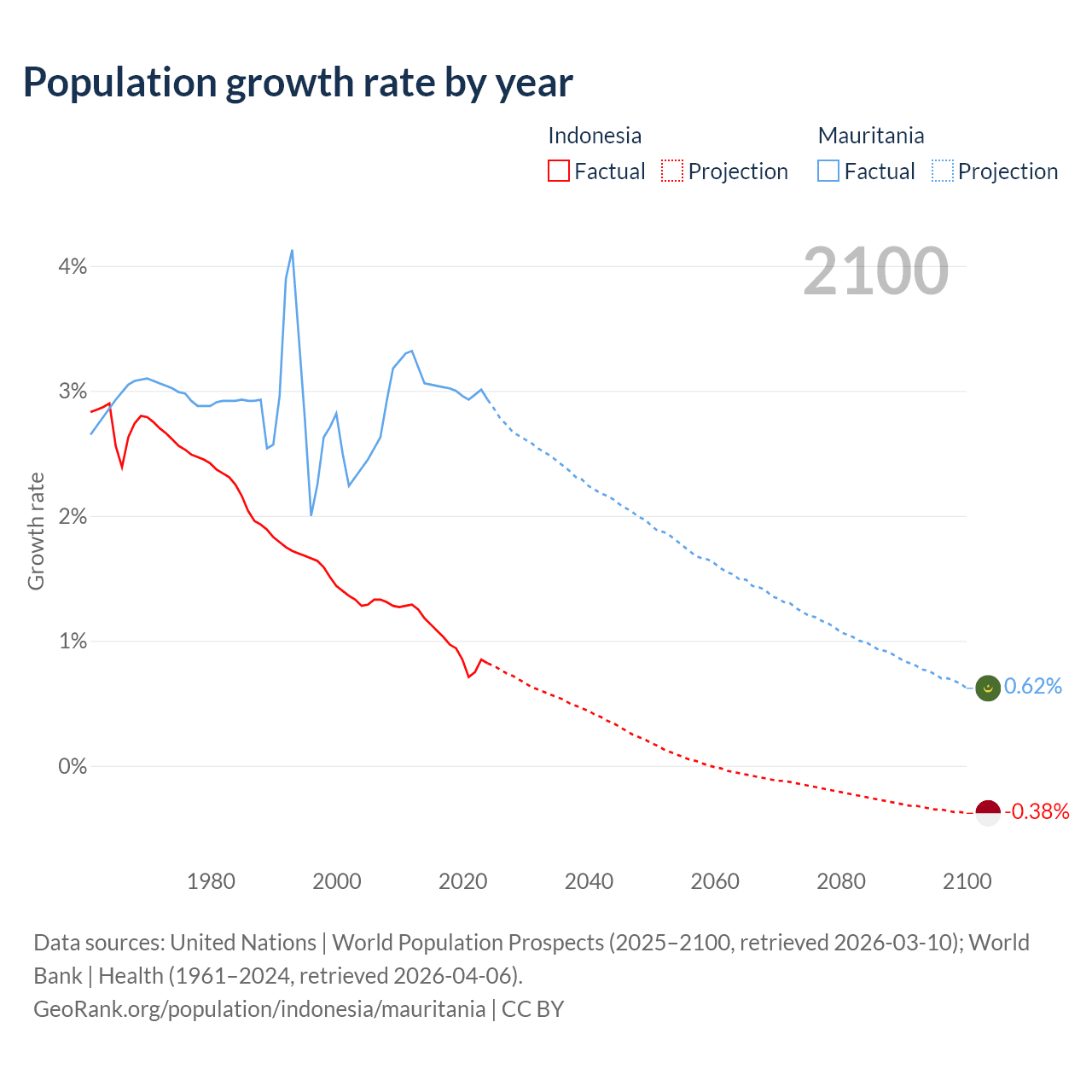 - For the last 10 years, Indonesia has had an average growth rate of +0.94% per year vs +3% in Mauritania.