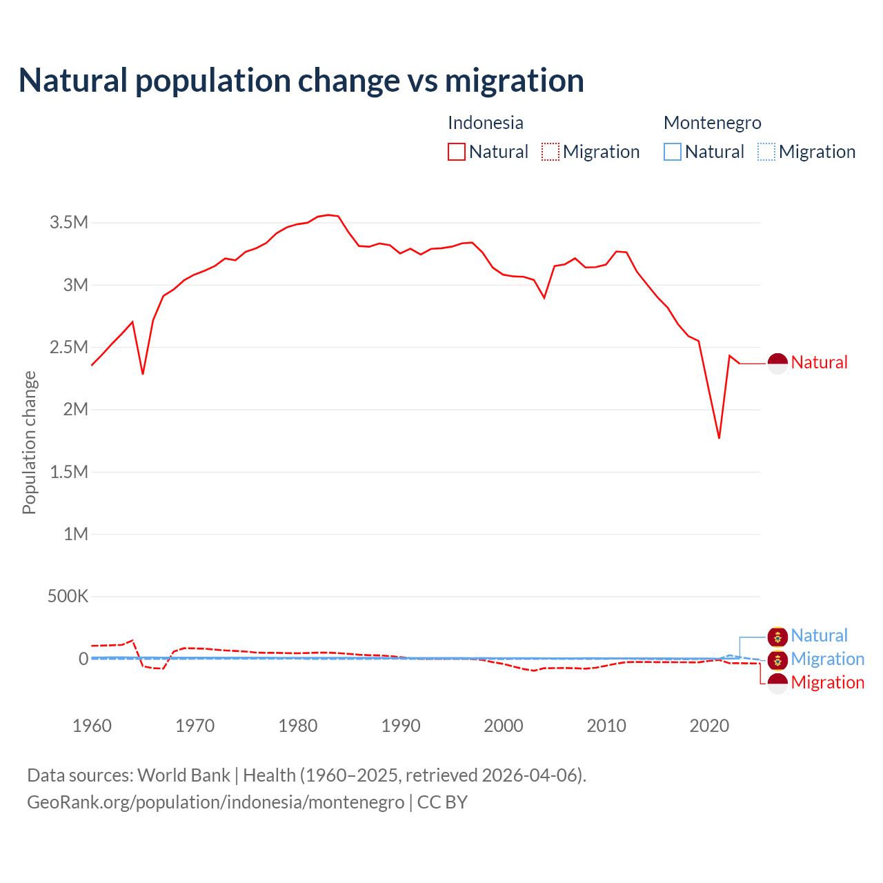 Over the last 10 years, 98.9% of the population change in Indonesia is from natural causes (a gain of 25,242,860 people) and 1.1% is from migration (a loss of 280,258 people). In Montenegro 52.4% is from natural causes (a gain of 4,501 people) and 47.6% is from migration (a gain of 4,095 people).