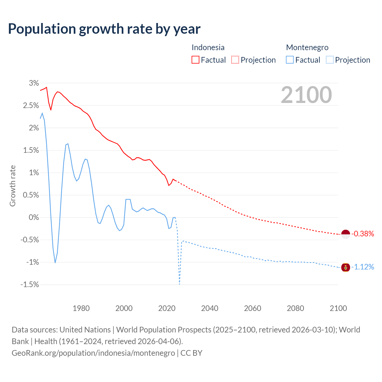 - For the last 10 years, Indonesia has had an average growth rate of +0.94% per year vs +0.01% in Montenegro.