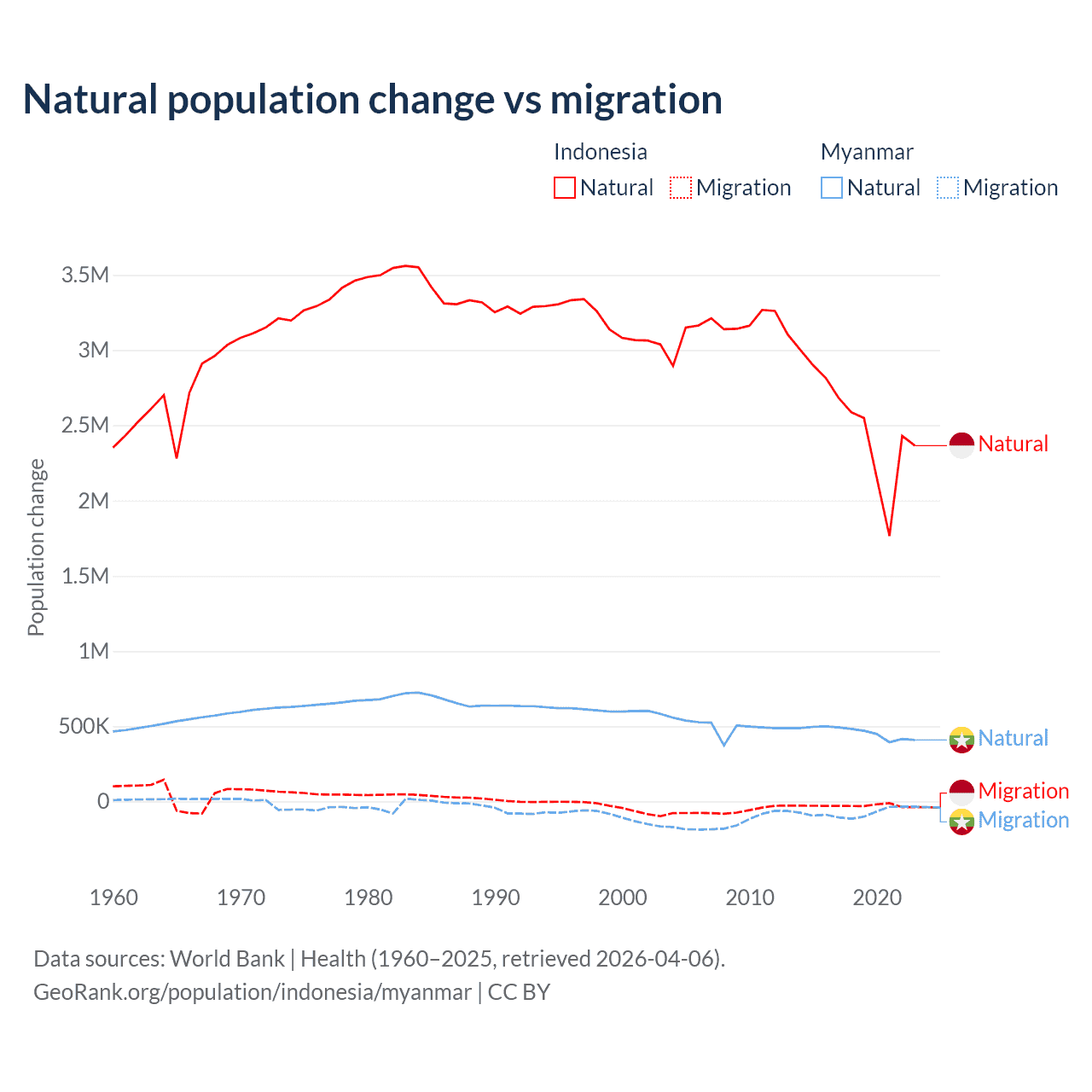 Over the last 10 years, 98.9% of the population change in Indonesia is from natural causes (a gain of 25,242,860 people) and 1.1% is from migration (a loss of 280,258 people). In Myanmar 86% is from natural causes (a gain of 4,594,615 people) and 14% is from migration (a loss of 749,272 people).